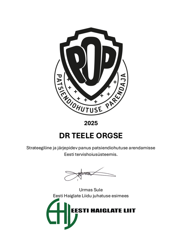 Pärnu Haiglast pälvis tunnustuse dr Teele Orgse, kes on enam kui kümne aasta jooksul järjekindlalt panustanud süsteemse patsiendiohutuse ja kvaliteedijuhtimise arendamisse. Tema töö ja pühendumus on aidanud kujundada haigla tegevusi turvalisema ja patsiendisõbralikuma tervishoiu suunas.